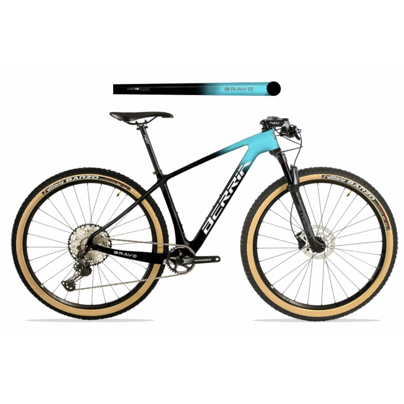 - CuadroCuadro Bravo 5 de carbono HMR2X construido en resina Matrix Nanotech y estructura de Triple monocasco/ geometría BGC cross country 29″/ tirantes Active Stay/ vainas asimétricas/ dirección O2HS sobredimensionada / sistema de freno Post Mounted / BB92 / recorrido interno del cableado/ boost 148 x12 /peso cuadro 1.150 gr