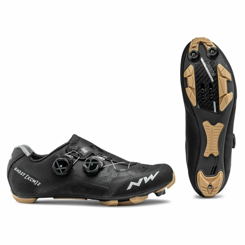 Suela de carbono XC 12 con inserción de carbono en la zona del pedal y un índice de rigidez de 12,0. Las inserciones de TPU en puntos estratégicos aseguran una alta tracción y una excelente resistencia al desgaste