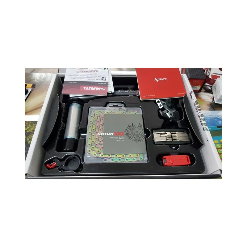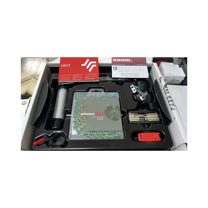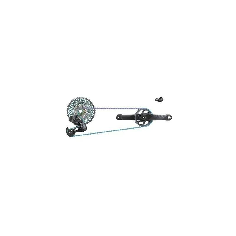 Cambio con batería, Maneta Trigger con pinza, bielas DUB 175 Plato Direct Mount 34D, Cadena arcoíris 126 eslabones, Cassette XG-1299 10×50, Cargador y ajustador de cambio