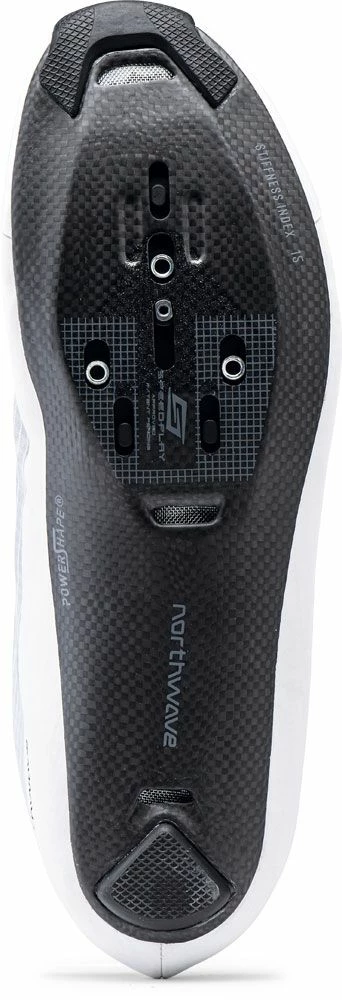 La tecnología ARS (Anatomic Reticular Support), un exoesqueleto que rodea y se adapta al pie, distribuye la carga de manera uniforme y controlada al pedalear. La suela ergonómica Powershape-15 está hecha de fibra de carbono unidireccional (compatible con los pedales Speedplay/Wahoo) y apoya el arco del pie, aumentando la presión del pedaleo. Las tres ventilaciones estratégicamente situadas en la suela mantienen los pies frescos incluso en los días más calurosos.